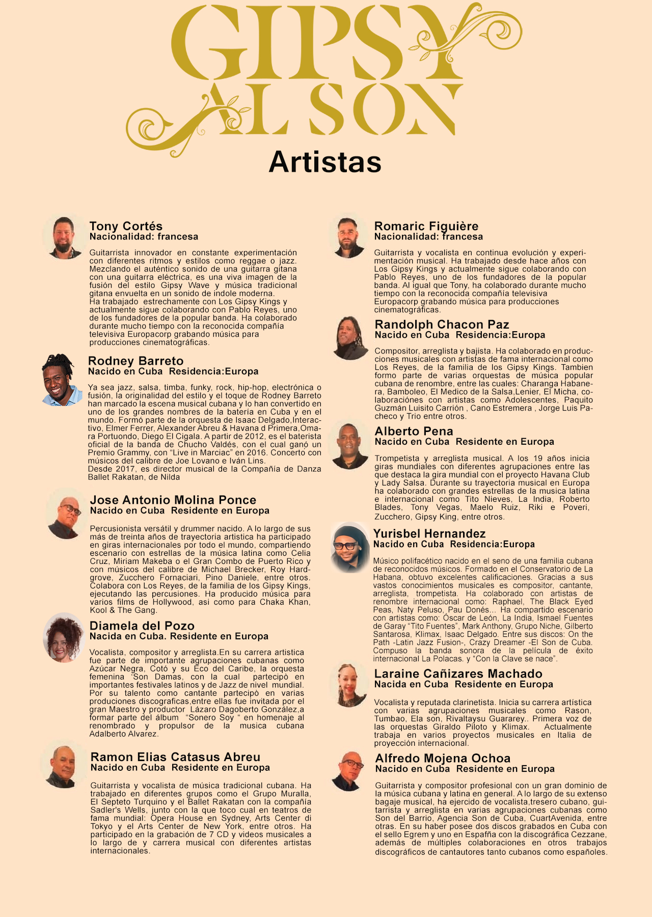 Gipsy al Son es una nueva y emocionante banda que reúne a músicos gitanos de la nueva generación de los Gipsy Kings y prestigiosos músicos cubanos. Esta colaboración única presenta una cautivadora fusión de Rumba Flamenca y Son Cubano, ambos reconocidos como patrimonio cultural de la humanidad por la UNESCO.